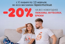 С 16 января по 28 февраля во всех фирменных магазинах «Брестские» скидка 20% на весь новогодний ассортимент пижам, футболок и брюк.